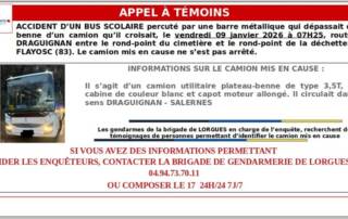 Après l’accident d’un bus scolaire à Flayosc, les gendarmes tentent d’identifier un camion en fuite et sollicitent les témoins. appel
