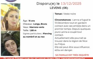 Disparue depuis le 13 décembre à Levens, Lanna Robledillo, 15 ans, fait l’objet d’un avis de recherche diffusé par l’A.R.P.D.
